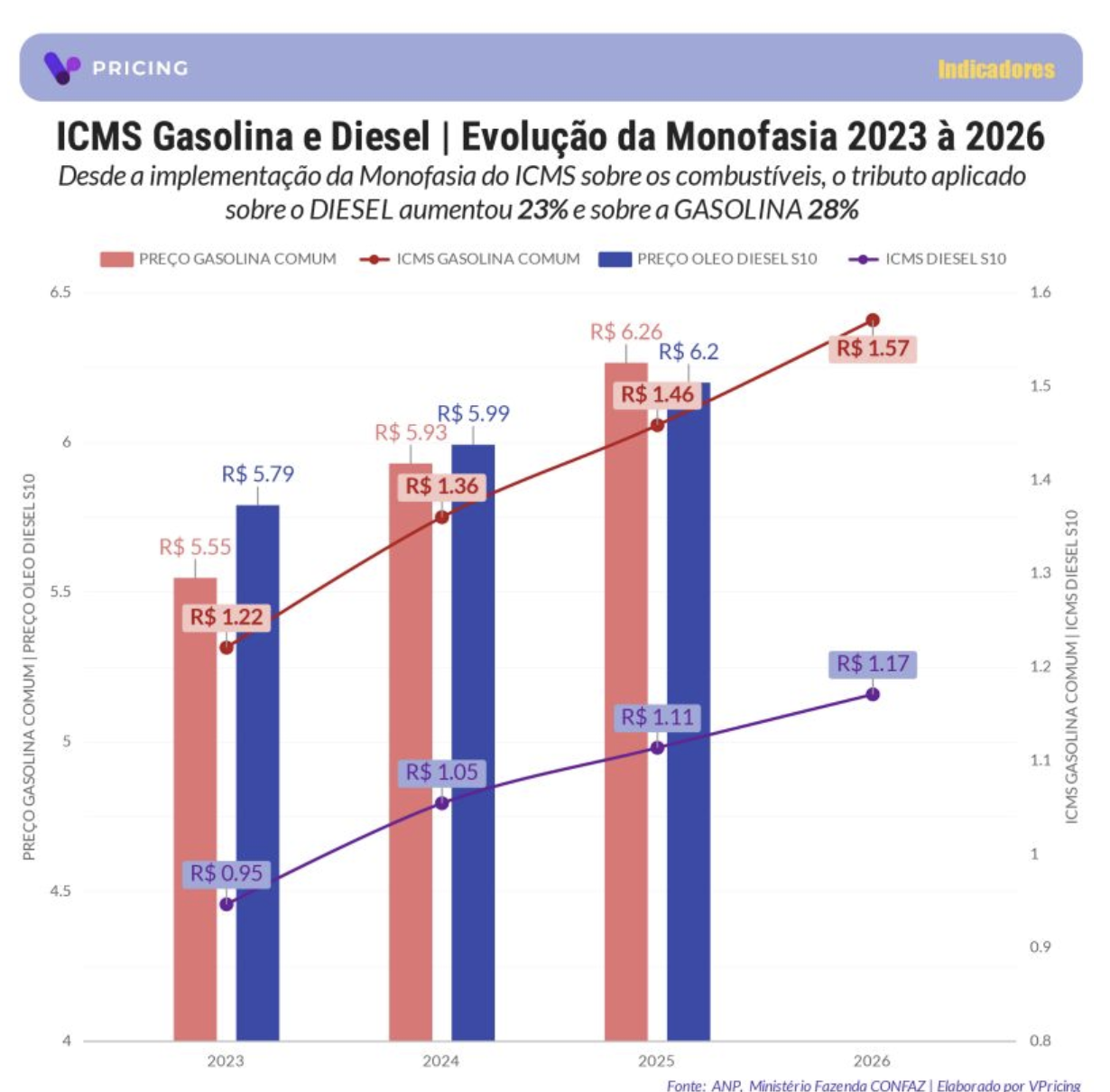 A partir do dia 01 de janeiro de 2026, entram em vigor as novas alíquotas do ICMS monofásico, para o diesel e para a gasolina, representando um aumento na carga tributária do imposto estadual sobre os dois produtos, tendo os seguintes impactos.: