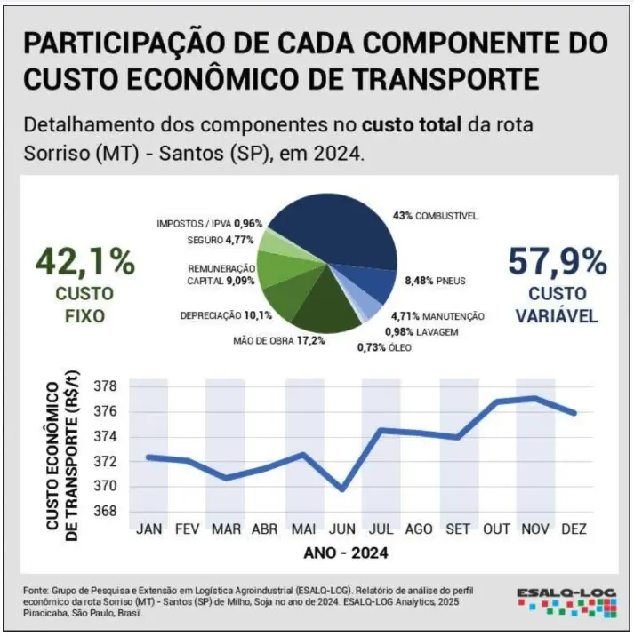 Estudos e levantamentos realizados por diversas instituições, como a ESALQ-LOG, demonstram que o custo do diesel na rota entre Sorriso/MT e Santos/SP, no ano de 2024, representou 43%.