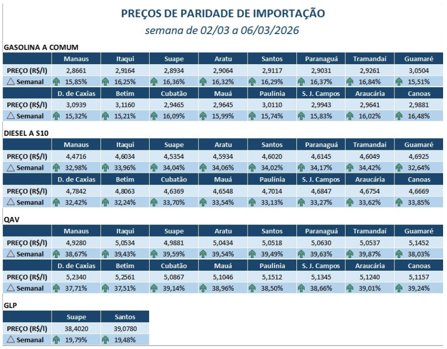 Com a guerra EUA x Irã as cotações do petróleo saltaram mais de 30% em apenas uma semana, ultrapassando a barreira psicológica dos US$ 100,00/bpd, e junto com a volatilidade do mercado da commodity os custos dos derivados também dispararam, como no caso do Diesel A S10 Importado o salto em uma semana foi de +38,50%, e é óbvio que se você é uma distribuidora e precisa importar Diesel o impacto de custo vai acontecer e deve ser repassado aos clientes.